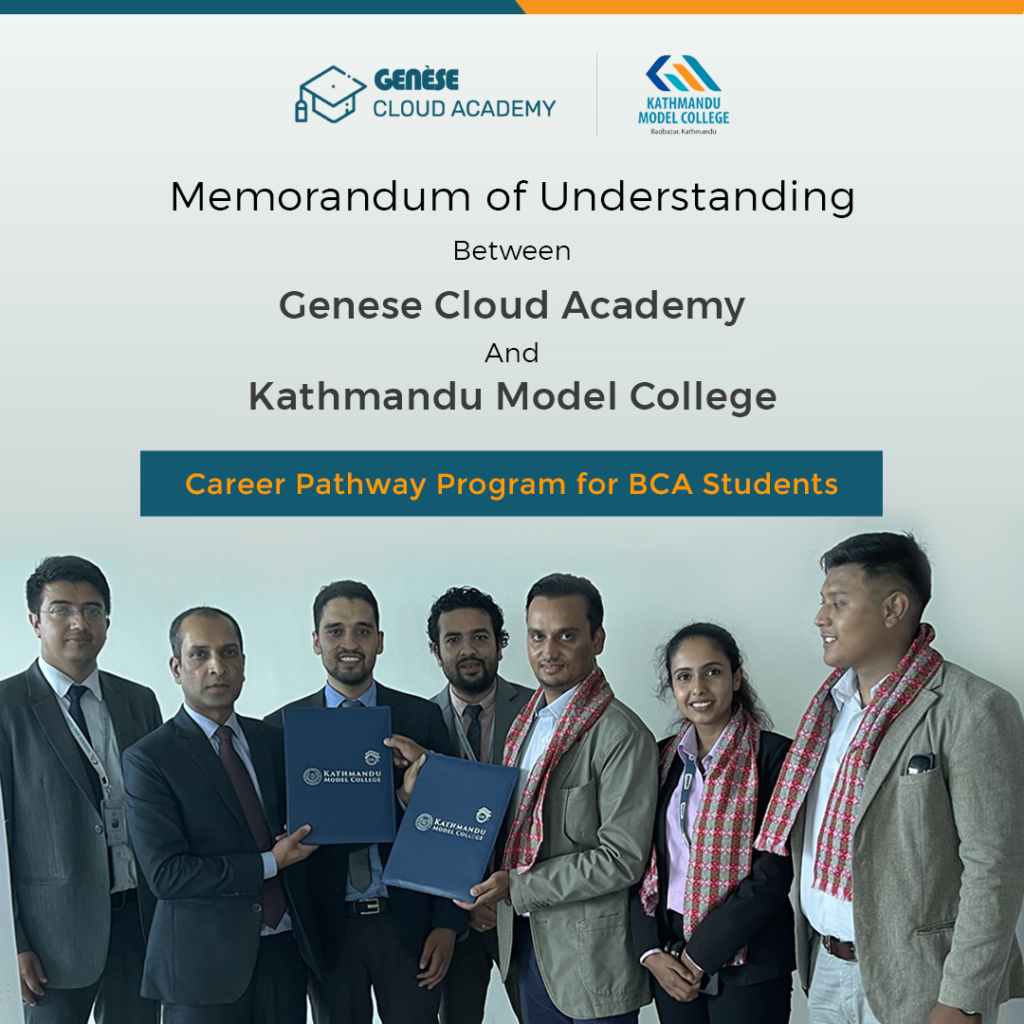 Genese Cloud Academy signed MoU with KMC, Bagbazar for Career Pathway program for students of Bachelors in Computer Application. The main objective of this collaboration is to provide industry-driven technical skills along with academia to boost the careers of the students. The major intent of this program is to build the work readiness of graduating BCA students.