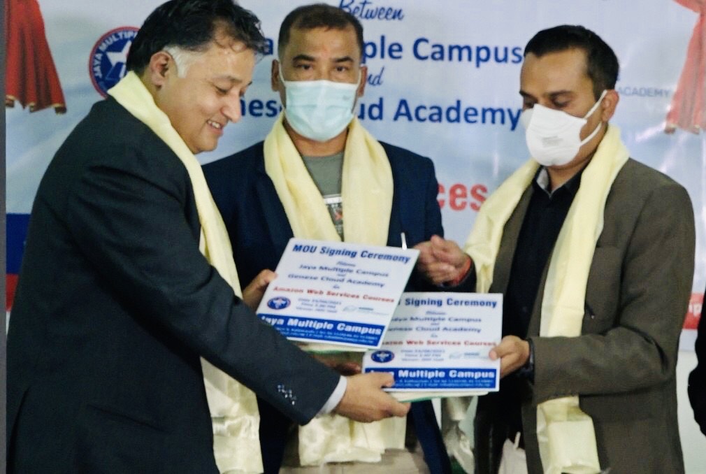 Jaya Multiple Campus and Genese Cloud Academy (GCA) have signed a Memorandum of Understanding and are working together to boost students’ knowledge of demanding technologies. GCA is employing the AWS platform for global certification, and based on market research, a career track for Bachelors (BCA) students has been created. The major goal of this collaboration is to teach young kids about cloud computing, artificial intelligence, cybersecurity, data science, and other related topics. This alliance also intends to ensure that as students progress through their education, they become more conversant with cloud technology, allowing them to prosper in an increasingly competitive global world.