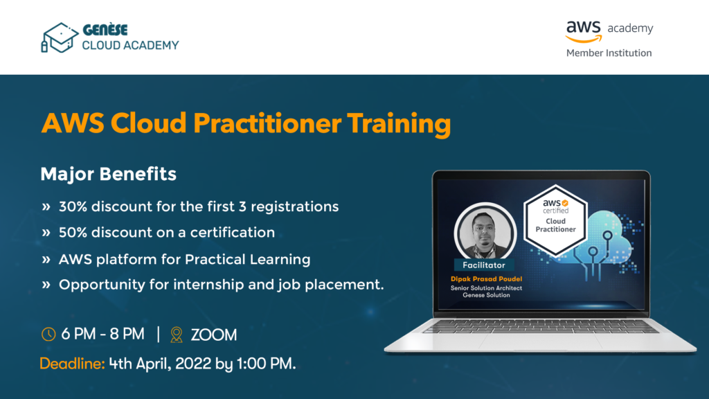 Genese Academy is organizing a training on AWS Cloud Practitioner Certification Preparation Course. This course is targeted at IT working professionals and students interested to start a career in the cloud. This course would be a great start for the AWS Cloud Practitioner Certification examination and to start your AWS journey that also provides technical & non-technical lessons to know what AWS has to offer. Course content includes an introduction to Cloud Computing, AWS Cloud, its advantages, its services, pricing, and support plans.